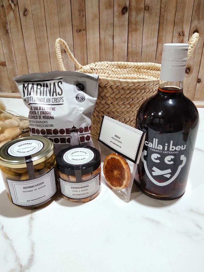 Botella de Vermut Artesanal «Calla i Beu»: El corazón del cesto es nuestra botella de vermut artesanal «Calla i Beu», una bebida de sabor inigualable que te invita a disfrutar de la conversación y la buena compañía. Perfecto para brindis especiales o para disfrutar en una tarde relajada.